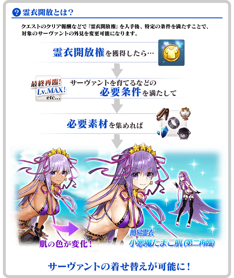 ※「霊衣開放」後は自動でバトルキャラやアイコンが切り替わります。「霊衣開放」前の状態に戻したい場合や、他の再臨段階に変更したい場合は、サーヴァント詳細画面より変更することができます。 ※ボイスは「霊衣開放」前の状態と同じものになります。 ※「霊衣開放」による変更はサーヴァントの外見のみで、クラスやパラメータなどに変化はありません。