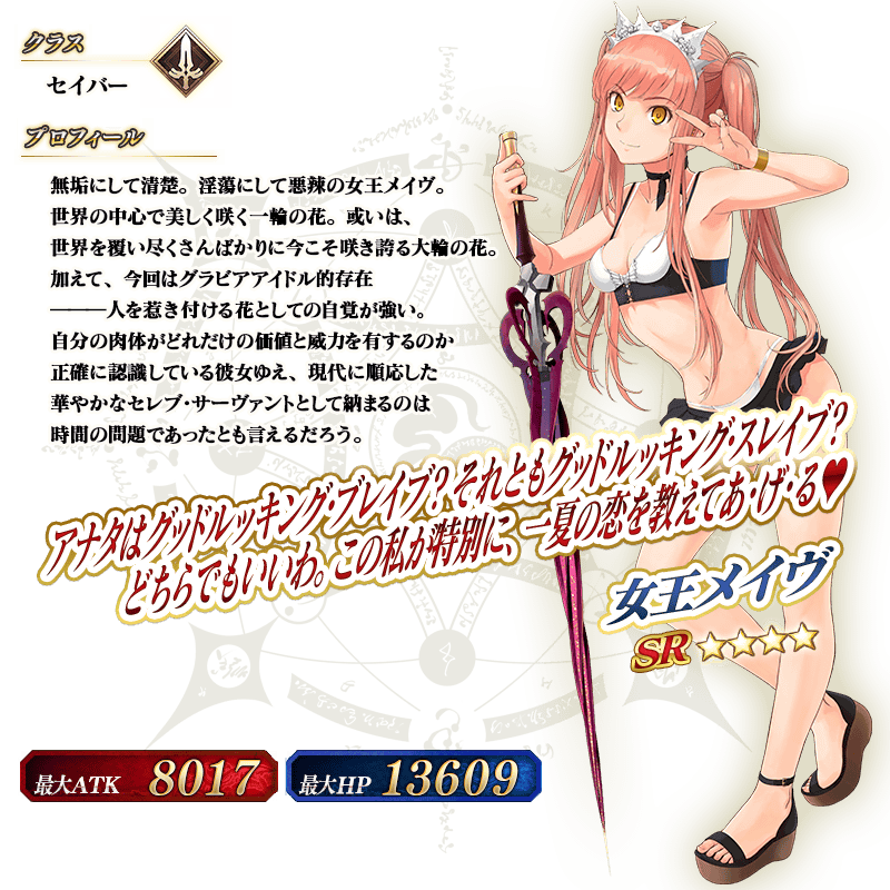 ※上記の「★4(SR)女王メイヴ(セイバー)」のイラストは霊基再臨第2段階のものです。