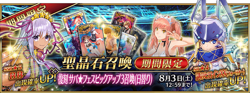 ※「復刻 サバ★フェスピックアップ3召喚(日替り)」は日替りとなり、「★4(SR)女王メイヴ(セイバー)」「★4(SR)謎のヒロインXX(フォーリナー)」はピックアップ期間中でも排出されない日がありますので、ご注意ください。