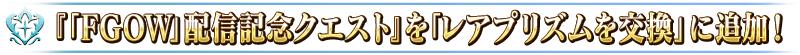 ※「レアプリズムを交換」に追加される『「Fate/Grand Order Waltz in the MOONLIGHT/LOSTROOM」配信記念クエスト』は恒常となり、交換期限はありません。 ※『「Fate/Grand Order Waltz in the MOONLIGHT/LOSTROOM」配信記念クエスト』をプレイできるのは1回のみになります。 ※『「Fate/Grand Order Waltz in the MOONLIGHT/LOSTROOM」配信記念クエスト』はプレイ後、マテリアルの「イベントクエストでの記録」に追加されます。 ※すでにプレイ済みの場合も、2020年12月8日(火) 18:00以降にマテリアルの「イベントクエストでの記録」に追加されます。 ※以前開催されていた『「Fate/Grand Order Waltz in the MOONLIGHT/LOSTROOM」配信記念クエスト』をクリアしている場合は交換できません。