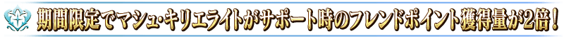 下記の期間中、クエスト開始時のサポート選択画面にて、サポートに他のマスターのマシュ・キリエライトを選択した場合と、他のマスターが自身のマシュ・キリエライトをサポートに選択した場合、フレンドポイントの獲得量が2倍になります。この機会にフレンドポイントをたくさん入手しましょう!