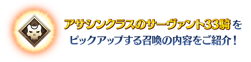※★4(SR)以上確定にはサーヴァントと概念礼装が含まれます。 ※アサシンクラス以外のサーヴァントも排出されますのでご注意ください。 ※2019年1月1日(火) 0:00以降に新たに配信されるメインストーリー、期間限定イベント、一部クエスト、キャンペーンおよび召喚では、真名隠し対象サーヴァントの真名が表示されます。