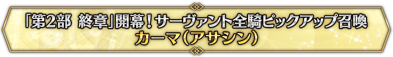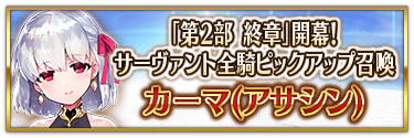 本召喚でピックアップされる以下のサーヴァントは、12月10日(水) 18:00~12月20日(土) 12:59までの期間で開催している『「第2部 終章」開幕! 英霊極点ピックアップ召喚』の排出対象となります。 ・★5(SSR)カーマ(アサシン) ・★4(SR)燕青(新宿のアサシン) ・アサシンクラスのすべての★3(R)恒常サーヴァント ※『「第2部 終章」開幕! 英霊極点ピックアップ召喚』では、該当サーヴァントはピックアップ対象ではございません。