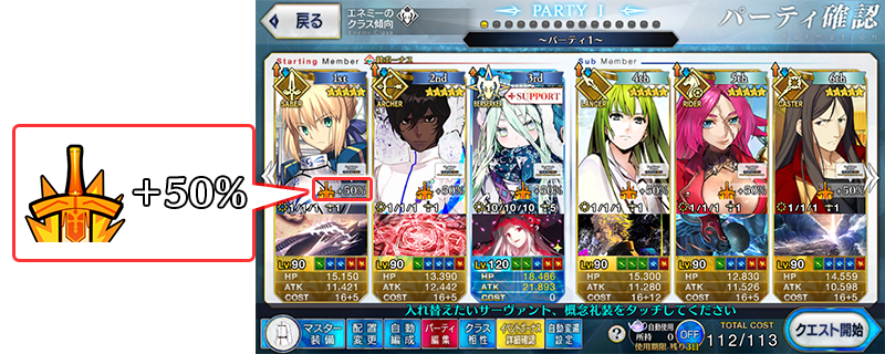第1部~奏章Ⅳまでのメインクエストにおいて、バトル開始時に味方サーヴァント全員のNPが50%チャージされます!