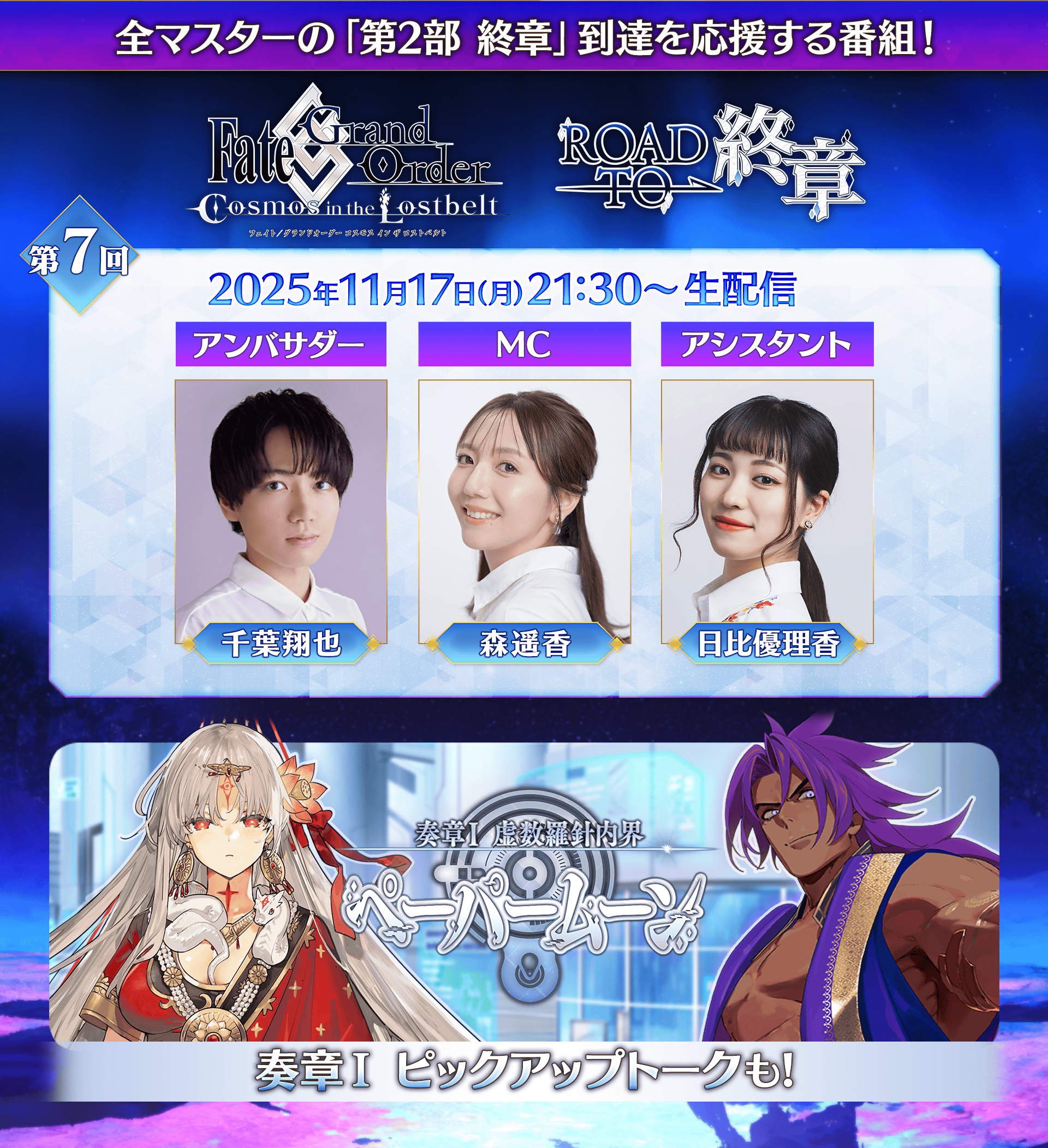 今回の配信で特集する「奏章Ⅰ 虚数羅針内界 ペーパームーン」に関連した、期間限定聖晶石召喚やフリークエストの初回クリアまで消費AP0を実施いたします!