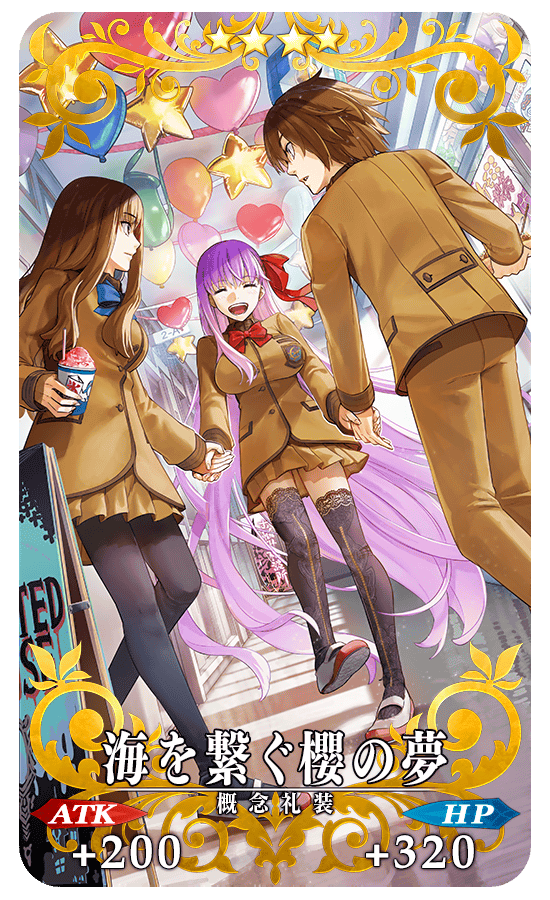 ※本召喚において、ストーリー限定の概念礼装「★4(SR)海を繋ぐ櫻の夢」は「奏章Ⅲ 新霊長後継戦 アーキタイプ・インセプション」をクリア済みの場合のみ排出され、ピックアップ対象となります。対象となるメインクエストをクリアしていない場合はピックアップ対象外となり、本召喚では排出されませんのでご注意ください。