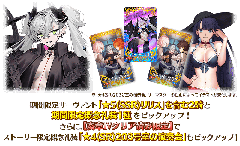 ※本召喚において、ストーリー限定の概念礼装「★4(SR)203号室の演奏会」は「奏章Ⅳ 人類裁決法廷 トリニティ・メタトロニオス」をクリア済みの場合のみ排出され、ピックアップ対象となります。対象となるメインクエストをクリアしていない場合はピックアップ対象外となり、本召喚では排出されませんのでご注意ください。