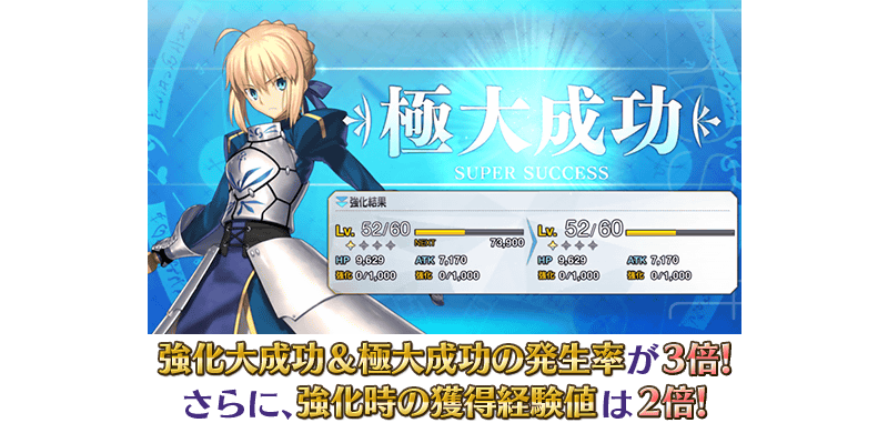 下記の期間中、サーヴァントの強化をおこなった際に、大成功(経験値2倍ボーナス)・極大成功(経験値3倍ボーナス)の発生率が3倍になります!