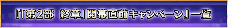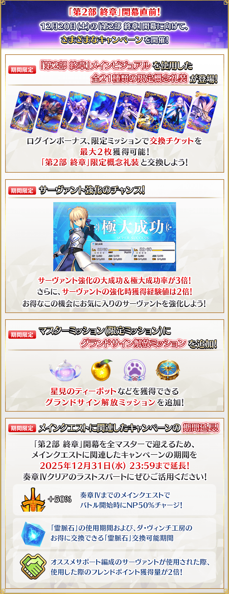 【期間限定】「第2部 終章」限定概念礼装を新規追加!「英霊極点交換チケット」と交換で、期間限定概念礼装を2枚入手可能に! 【期間限定】サーヴァントの強化大成功&極大成功率が3倍!さらに、サーヴァントの強化獲得経験値2倍! 【期間限定】マスターミッション(限定ミッション)にグランドサイン解放ミッションを追加! 【期間限定】期間延長!「第2部 終章」開幕までの特別企画!奏章Ⅳまでのメインクエストでバトル開始時にNP50%チャージ! 【期間限定】コンティニューアイテム「霊脈石」の使用期間および、ダ・ヴィンチ工房のお得に交換できる「霊脈石」交換可能期間を延長! 【期間限定】期間延長!オススメサポート編成のサーヴァントが使用された際、使用した際のフレンドポイント獲得量が2倍! 【恒常】マテリアル(ギャラリー)に過去のイベントクエストを追加!