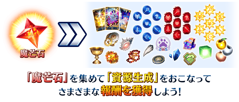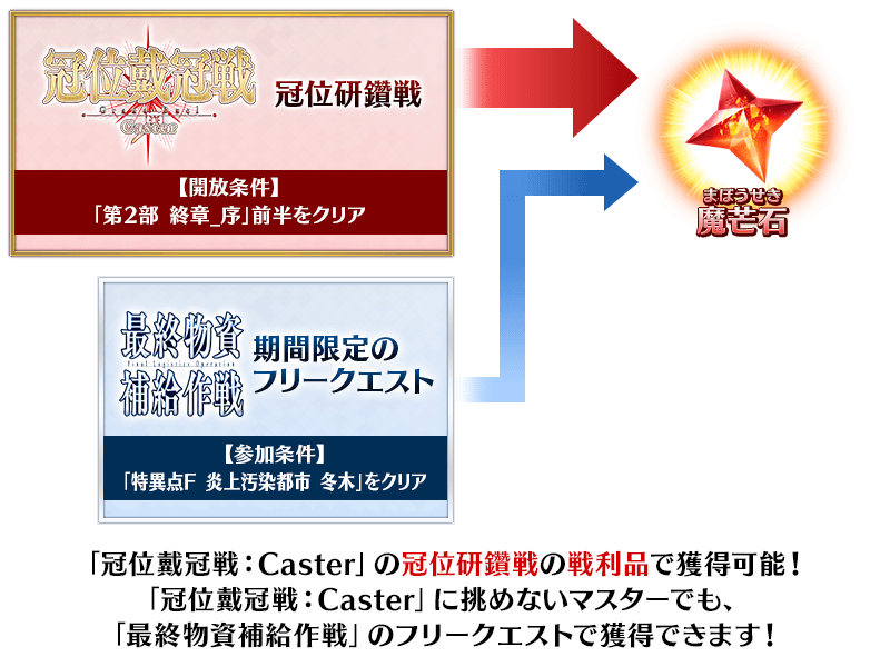 また、「冠位戴冠戦:Caster」と同時に始まる「最終物資補給作戦」にて「資源生成」をおこなうために必要な「魔芒石」を冠位研鑽戦の戦利品として獲得できます。