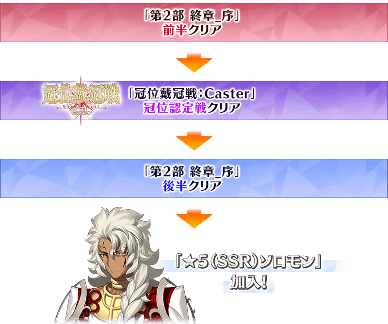 2025年12月3日(水)開幕の「冠位戴冠戦:Caster」の冠位認定戦をクリアすると開放される「第2部 終章_序」後半をクリアすることで、「★5(SSR)ソロモン」が加入します!