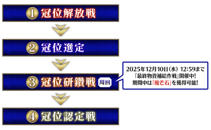 「冠位戴冠戦」は「冠位解放戦」「冠位研鑽戦」「冠位認定戦」の3つからなり、それぞれのバトルをクリアすることで「グランドサーヴァントの選定(冠位選定)」や「グランドスコアの強化」などをおこなえるようになります。