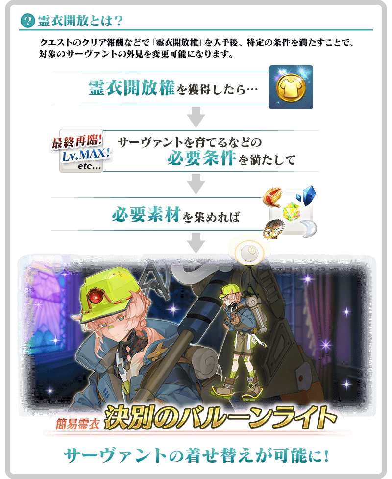 ※「霊衣縫製」に追加される簡易霊衣「決別のバルーンライト」の開放権は恒常となり、交換期限はありません。 ※すでに交換対象の霊衣開放権を取得されている方については、交換することができません。 ※今回追加される「★4(SR)ヴァン・ゴッホ〔マイナー〕」の霊衣は外見のみ変化し、ボイスは変化しない「簡易霊衣」です。