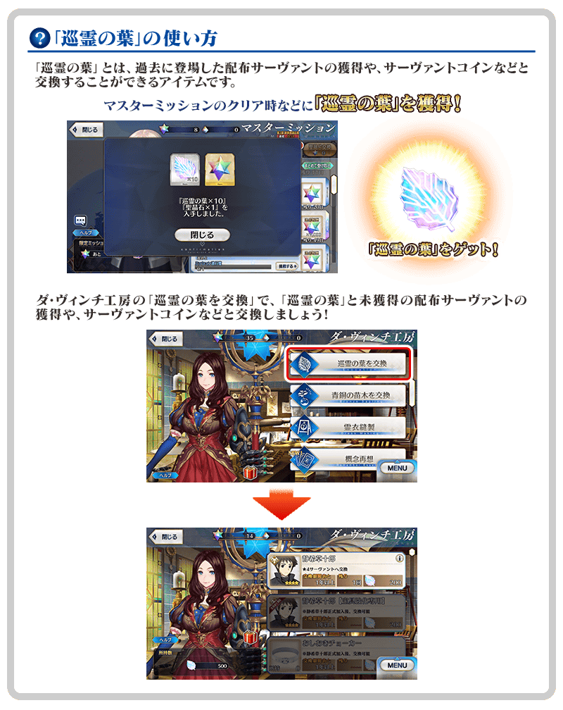 「巡霊の葉」の獲得対象は期間限定ではなく、恒常的にダ・ヴィンチ工房の「巡霊の葉を交換」のラインナップに追加されます。