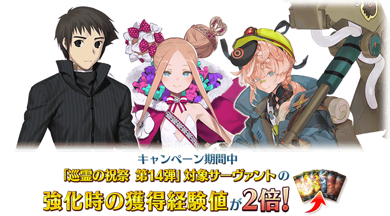 下記の期間中、「巡霊の祝祭 第14弾」関連サーヴァントの強化をおこなった際に、期間限定で獲得経験値が2倍になります!