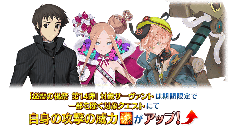 「巡霊の祝祭 第14弾」関連サーヴァントは、期間中に一部を除く対象クエストにおいて、自身の攻撃の威力アップのボーナスが得られます!