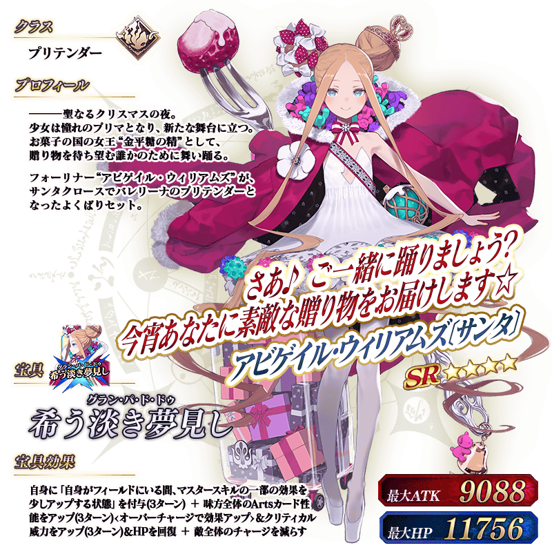 ※「★4(SR)アビゲイル・ウィリアムズ〔サンタ〕」は、マスターの性別によって一部宝具演出が変化します。