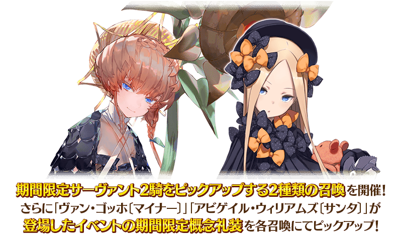 また、「ヴァン・ゴッホ〔マイナー〕」と「アビゲイル・ウィリアムズ〔サンタ〕」が登場したイベントの、期間限定概念礼装を各召喚にてピックアップいたします!