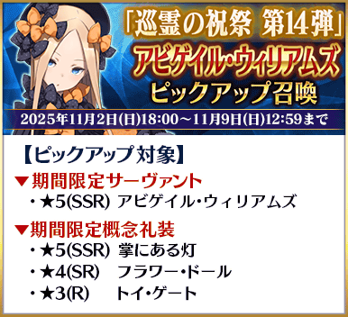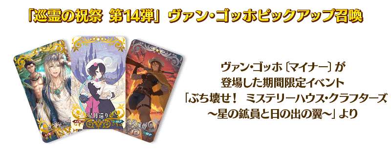 「巡霊の祝祭 第14弾」対象サーヴァントに関連するサーヴァントの中から、期間限定サーヴァント「★5(SSR)ヴァン・ゴッホ」と「★5(SSR)アビゲイル・ウィリアムズ」をピックアップする2種類の召喚を開催いたします!