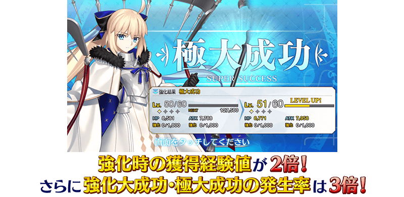 さらに、大成功(経験値2倍ボーナス)・極大成功(経験値3倍ボーナス)の発生率は3倍になります!