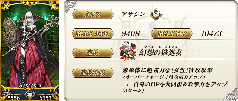 ※上記の「★4(SR)カーミラ(アサシン)」のセイントグラフは霊基再臨第2段階のものです。