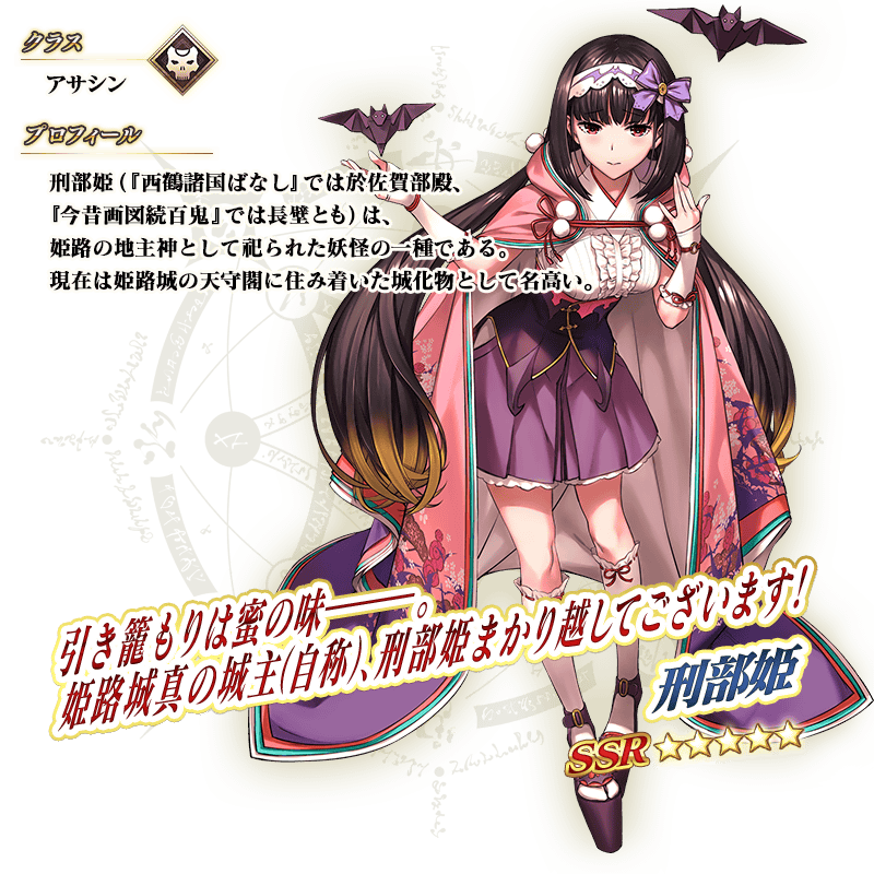 ※上記の「★5(SSR)刑部姫(アサシン)」のイラストとセイントグラフは霊基再臨第2段階のものです。