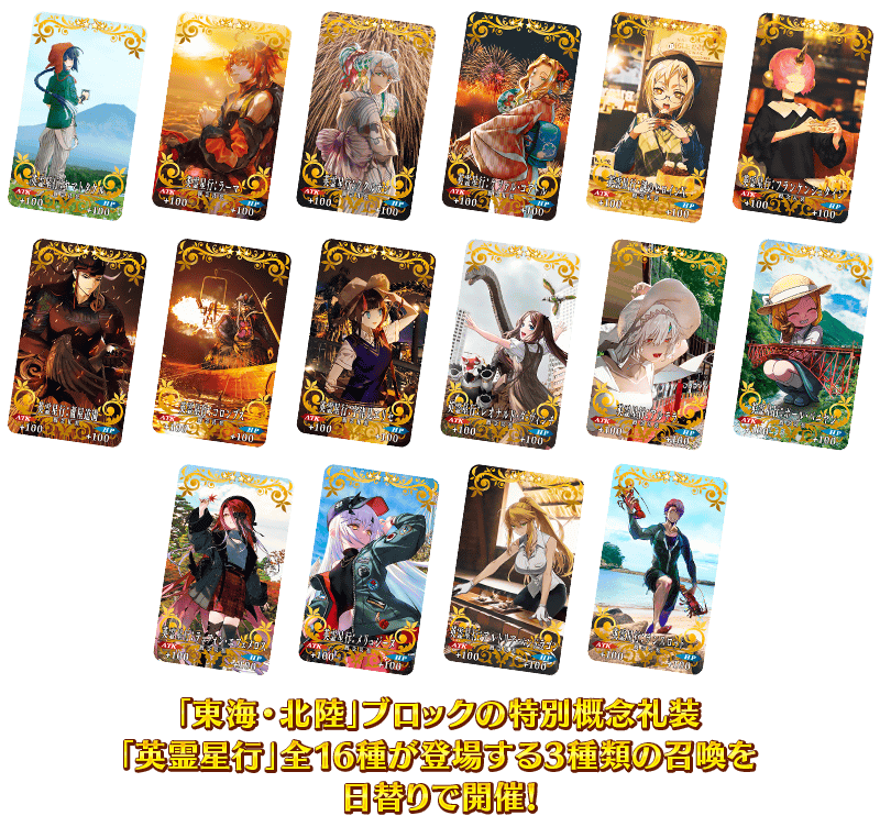 その描き下ろしイラストのうち、「東海・北陸」ブロック16種類の特別概念礼装「英霊星行」をピックアップする3種類の召喚を開催!