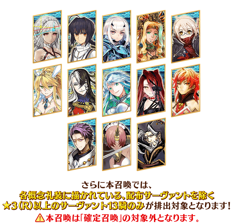 ※本召喚で排出されるサーヴァントは対象のもののみとなり、それ以外の「期間限定」、「ストーリー召喚」、「恒常」サーヴァントは排出されません。また、期間限定サーヴァントは開催期間終了後、ストーリー召喚には追加されません。