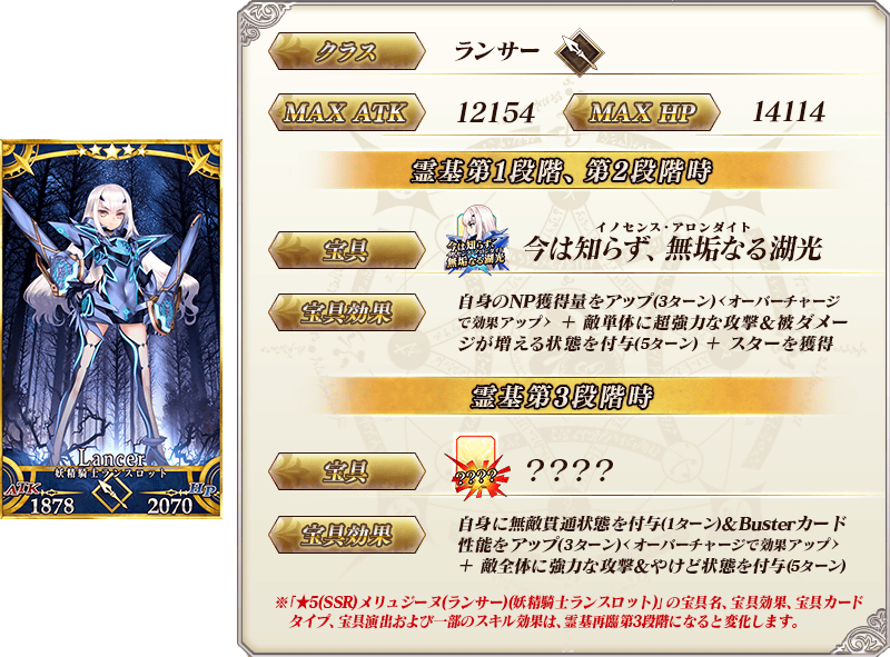 ※「★5(SSR)メリュジーヌ(ランサー)(妖精騎士ランスロット)」は、霊基再臨第1段階または第2段階の場合のみ、バトル中に特定のスキルを使用すると霊基再臨第3段階に変化し、一部スキルの効果と宝具効果を変化させることができます。また、スキルの効果で霊基再臨第3段階に変化させた場合は、そのバトル中は同様にスキルを使用して第1・第2段階に戻すことはできません。 ※第3段階へ霊基再臨させた後、第1・第2段階時の宝具およびスキルを使用したい場合は、サーヴァント詳細画面でバトルキャラの設定を第1段階または、第2段階に変更することで使用可能になります。 ※特定の霊基再臨段階解放前は、「変化後の宝具カード」のイラストの一部が非表示になっております。 ※「★5(SSR)メリュジーヌ(ランサー)(妖精騎士ランスロット)」は、「★5(SSR)妖精騎士ランスロット」を霊基再臨第2段階にすることで名称が「★5(SSR)メリュジーヌ」に変化します。 ※「★5(SSR)メリュジーヌ(ランサー)(妖精騎士ランスロット)」の霊基再臨第3段階は、「Lostbelt No.6 妖精円卓領域 アヴァロン・ル・フェ 星の生まれる刻」のネタバレを含みます。あらかじめご了承ください。