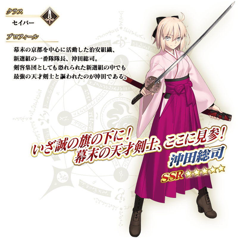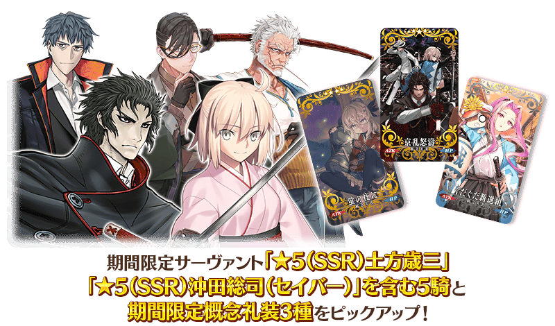 期間限定イベント「幕末チャンバラ神話 ぐだぐだ新選組・ジ・エンド REVENGE OF MAKOTO」の開幕を記念して、期間限定サーヴァント「★5(SSR)土方歳三」「★5(SSR)沖田総司(セイバー)」を含む5騎と期間限定概念礼装3種をピックアップ!