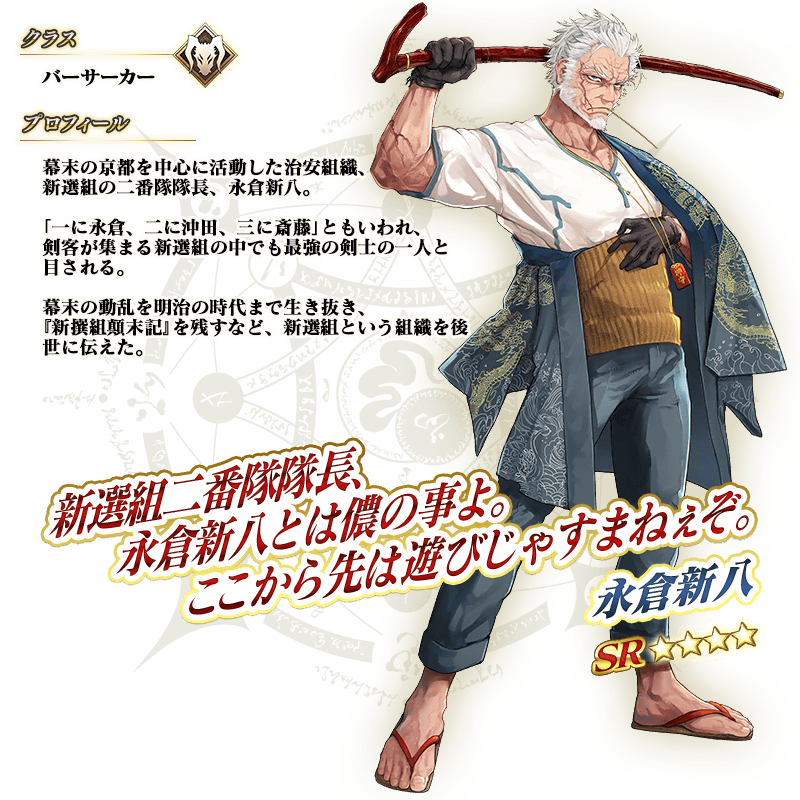 期間限定イベント「幕末チャンバラ神話 ぐだぐだ新選組・ジ・エンド REVENGE OF MAKOTO」の報酬として、「★5(SSR)土方歳三」の霊衣「浅葱の羽織袴」の開放権が登場!