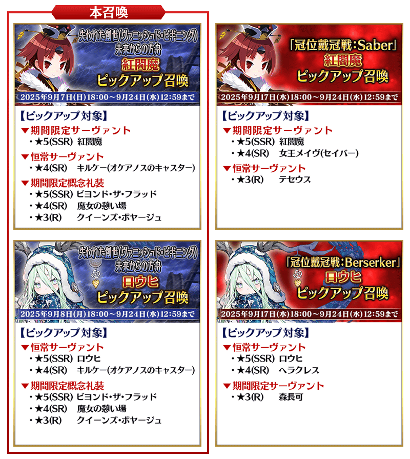 「★5(SSR)紅閻魔」「★5(SSR)ロウヒ」は「失われた創世(ヴァニッシュド・ビギニング) 未来からの方舟ピックアップ2召喚」でピックアップされるほかに、9月17日(水) 18:00より開催されている『「冠位戴冠戦:Saber」&「冠位戴冠戦:Berserker」ピックアップ召喚』でもピックアップされます。