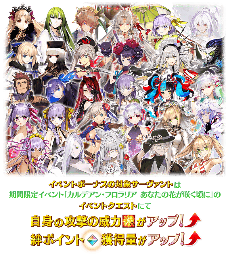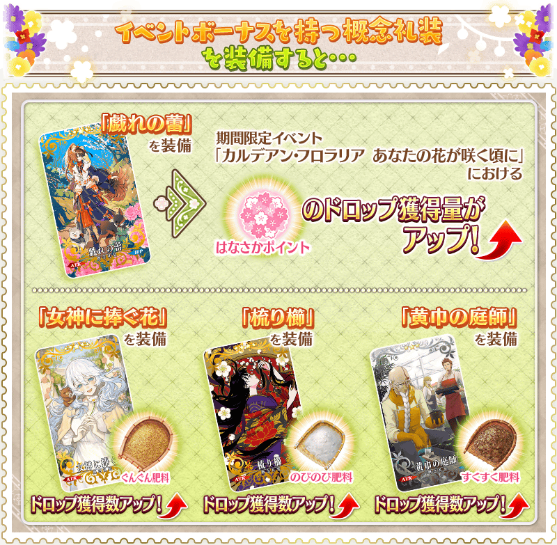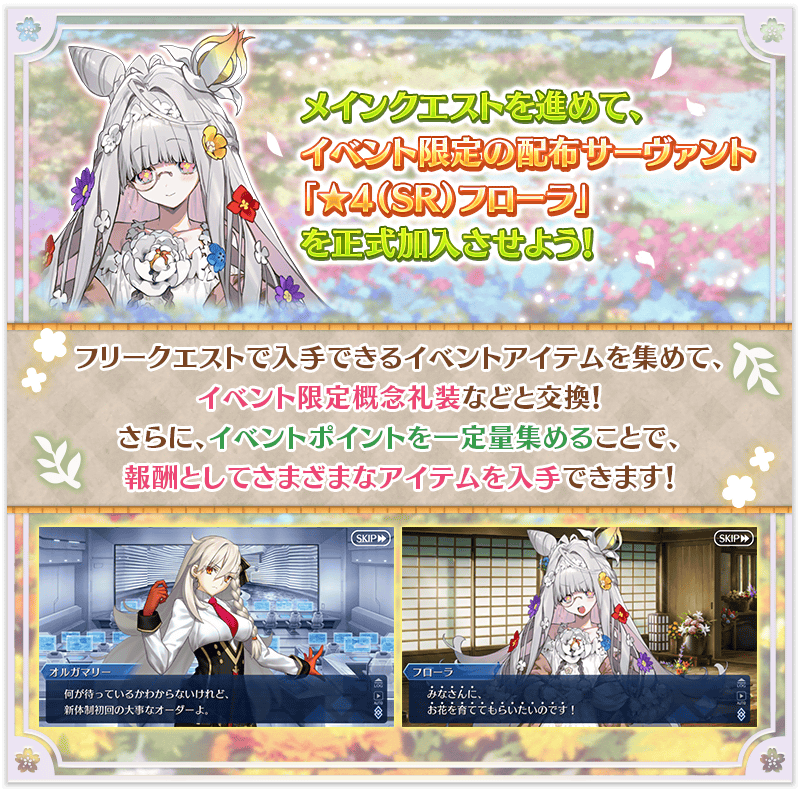 ※「★4(SR)フローラ」の霊基再臨素材「花園のコサージュ」および宝具強化専用霊基は、特定のメインクエストをクリア後に交換可能になります。 ※「★4(SR)フローラ」のサーヴァントコイン、伝承結晶、英霊結晶・流星のフォウくんALL★4(HP)、英霊結晶・日輪のフォウくんALL★4(ATK)については、本イベントの「メインクエスト エピローグ」をクリアすることで交換可能になります。 ※イベントアイテム交換期間終了後「ぐんぐん肥料」「のびのび肥料」「すくすく肥料」は消滅します。