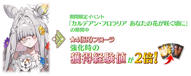 本イベントの期間中は、「★4(SR)フローラ」を強化した際の獲得経験値が2倍になります。