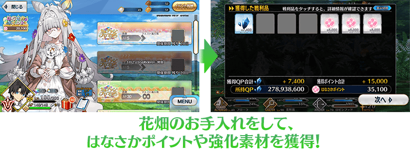 「お手入れクエスト」は1度だけクリア可能なクエストとなり、クリアするとたくさんのはなさかポイントやサーヴァントの強化素材を獲得できます。