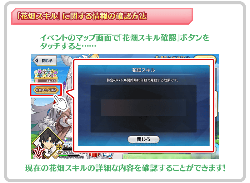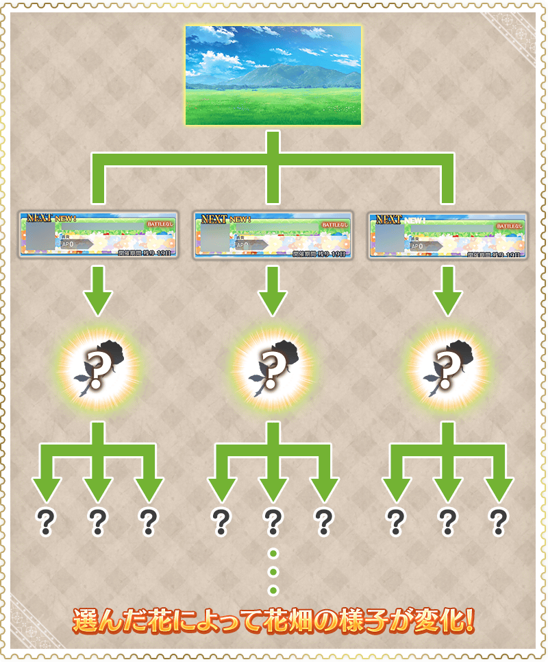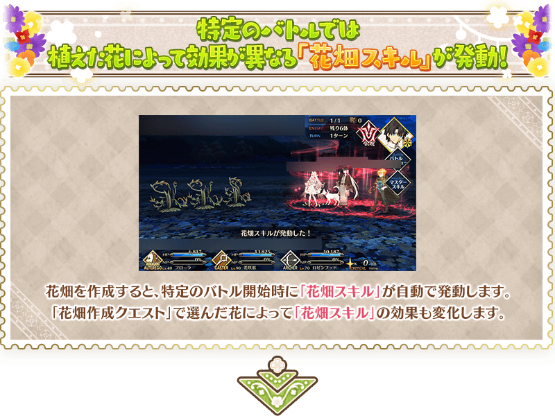 「花畑作成クエスト」で花畑を作成すると、本イベントの特定のメインクエスト、フリークエストのバトル開始時に「花畑スキル」が自動的に発動します。