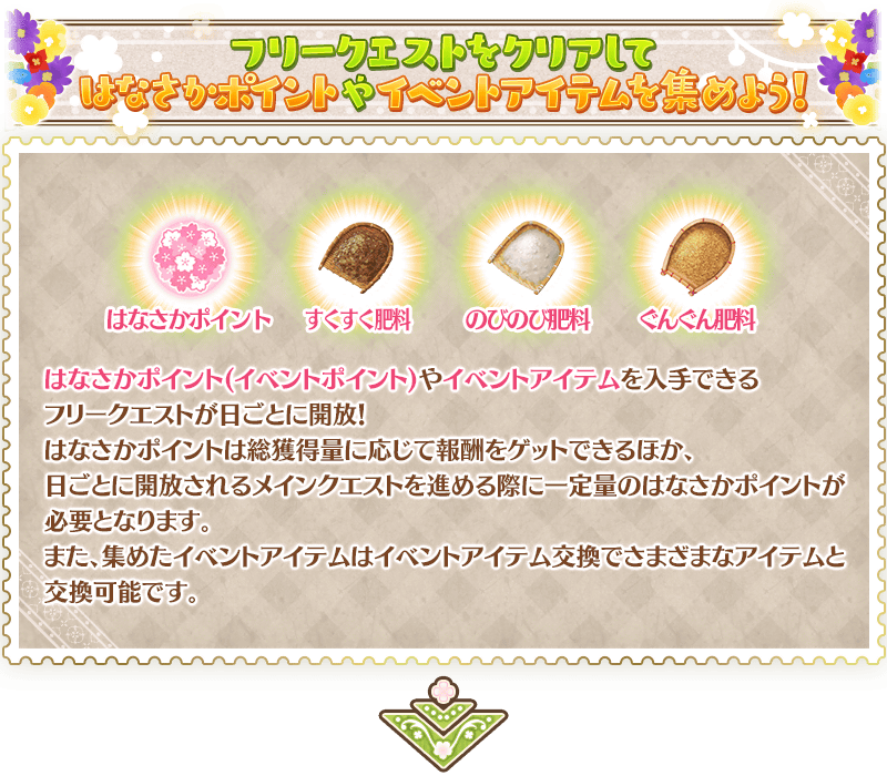 また、はなさかポイントやイベントアイテムを集められるフリークエストも日ごとに開放されます。