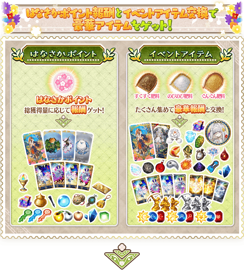 「はなさかポイント」の総獲得量が一定量に到達するごとに、達成報酬として各種サーヴァントの育成素材のほか伝承結晶などを獲得できます。
