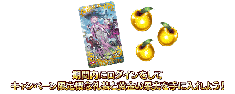 下記期間中に3回ログイン(1日1回カウント)すると、最大でキャンペーン限定概念礼装「★4(SR)サテライトステーション26」、黄金の果実3個をプレゼント!