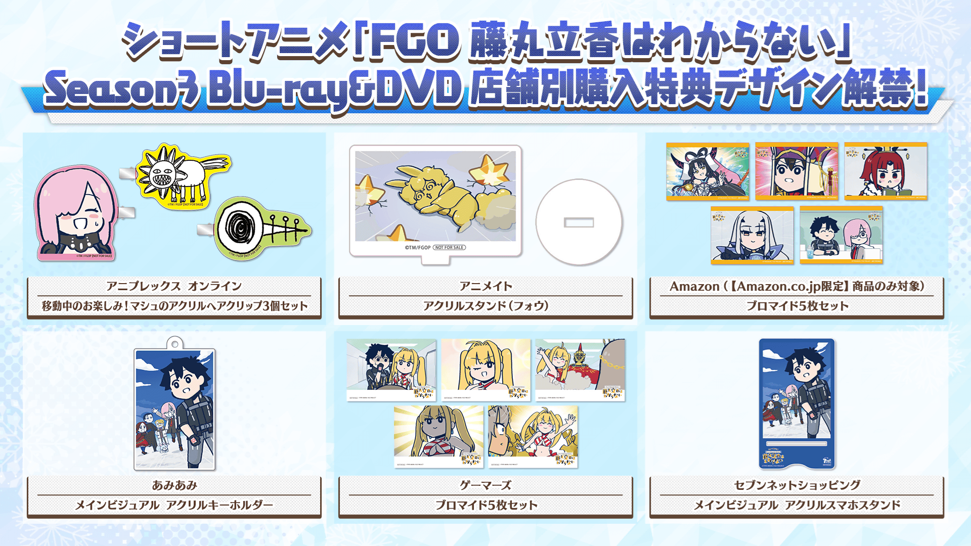 ショートアニメ「Fate/Grand Order 藤丸立香はわからない」Season3のBlu-ray&DVD店舗別購入特典・店舗共通先着購入特典のデザインを解禁いたしました。