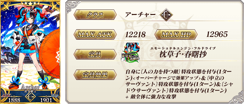 ◆最大解放時効果◆ 自身に必中状態を付与&毎ターンNP5%獲得状態を付与&魅了耐性が10%ダウン【デメリット】 |