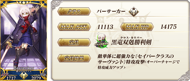 ◆最大解放時効果◆ 自身の登場時にスターを12個獲得(1回)&Busterカード性能を5%アップ&宝具威力を10%アップ |