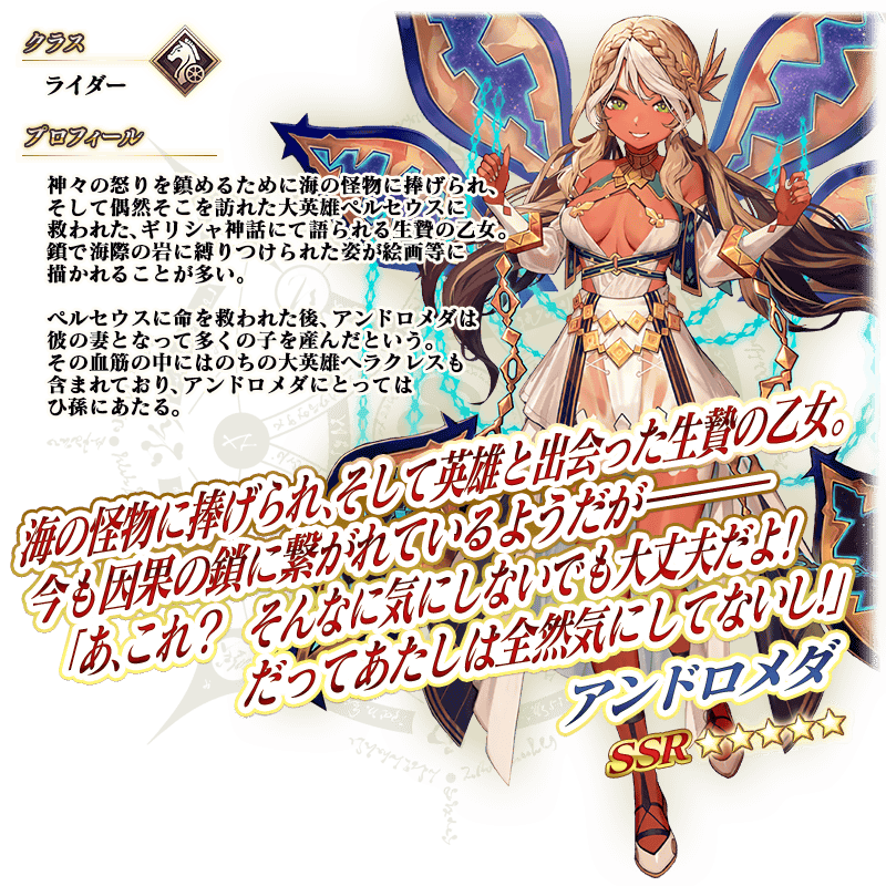 ※「★5(SSR)アンドロメダ」は霊基再臨第3段階解放後、サーヴァント詳細画面でセイントグラフを拡大表示した際に、霊基再臨第3段階のイラスト全体が表示されたバージョンを鑑賞できます。