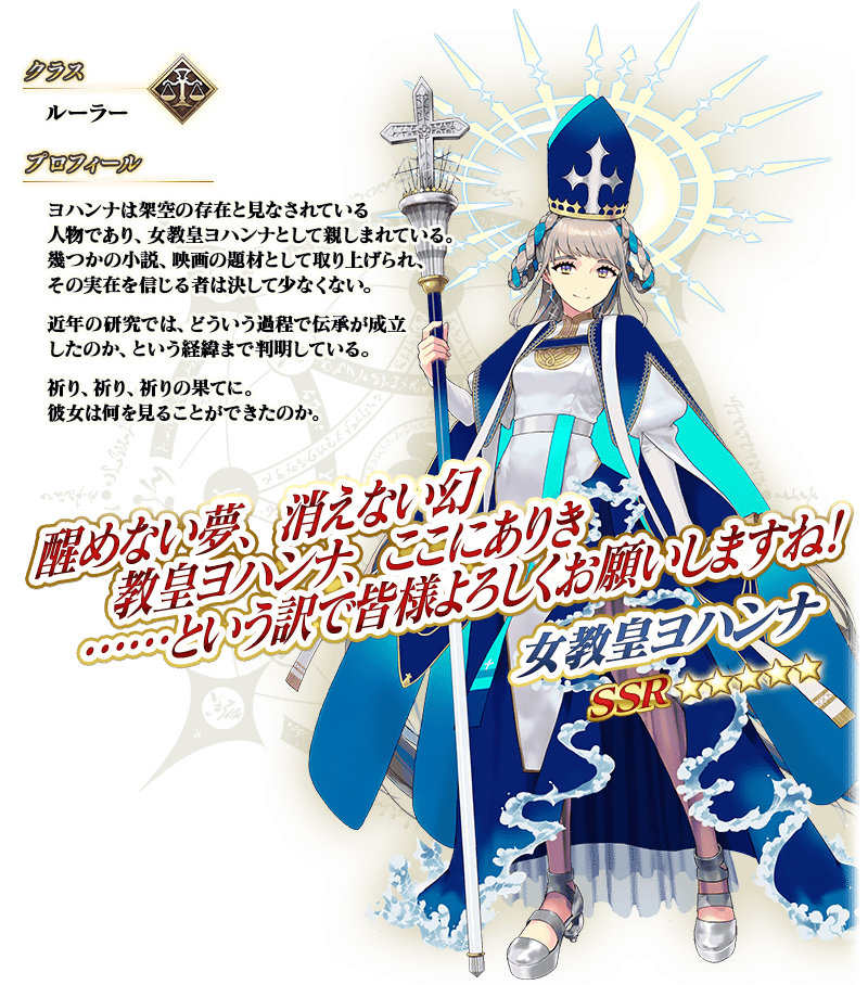 ※上記の「★5(SSR)女教皇ヨハンナ」のイラストとセイントグラフは霊基再臨第3段階のものです。
