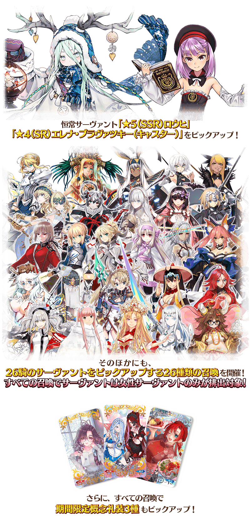 すべての召喚でサーヴァントは女性サーヴァントのみが排出対象となるほか、期間限定概念礼装3種もピックアップ!