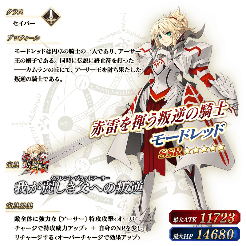 ※上記の「★5(SSR)モードレッド(セイバー)」のイラストは霊基再臨第2段階のものです。