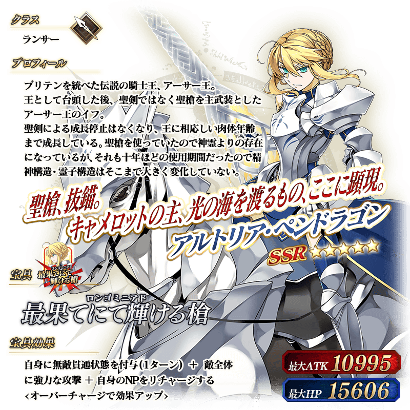 ※上記の「★5(SSR)アルトリア・ペンドラゴン(ランサー)」のイラストは霊基再臨第2段階のものです。