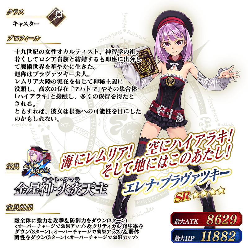 ※上記の「★4(SR)エレナ・ブラヴァツキー(キャスター)」のイラストは霊基再臨第2段階のものです。