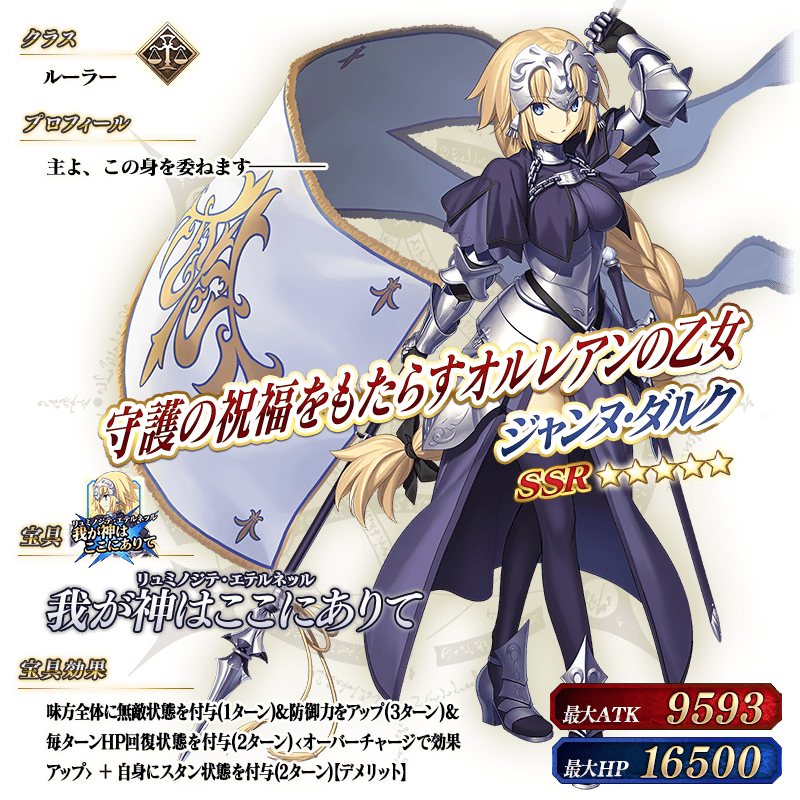 ※上記の「★5(SSR)ジャンヌ・ダルク(ルーラー)」のイラストは霊基再臨第2段階のものです。