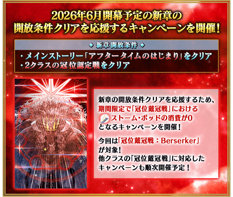 『新章開放条件クリア応援「冠位戴冠戦:Berserker」ストーム・ポッド消費0!キャンペーン』の開幕を記念した特別回数ログインボーナスを実施いたします。